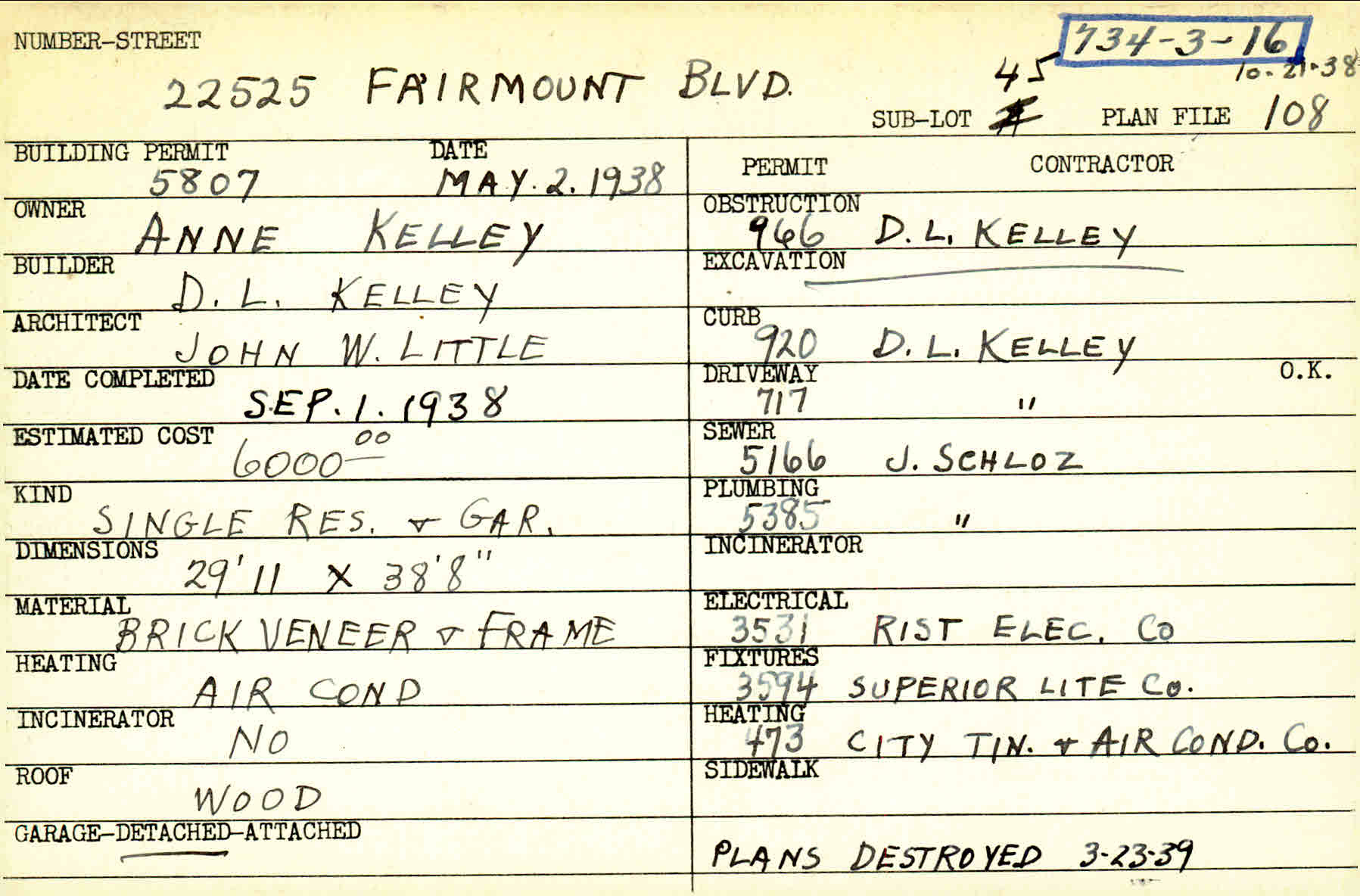 22525 Fairmount Boulevard Shaker Heights, OH 44122 PARCEL ID: 734-03-015 Building Permit Date: 05-02-1938 Neighborhood: Mercer Owner: Kelley, Anne Builder: Kelley, D. L. Architect: Little, John W. Estimated Cost: 6000 Date Completed: 09-01-1938 Kind: Single, Single Residence or Dwelling Material: Brick Veneer & Frame Heating: Air Conditioned Roof: Wood Garage: detached Card Available: Yes Blueprints: no blueprints on microfilm |