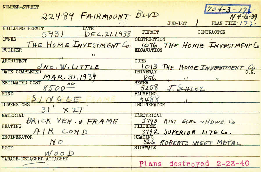 22489 Fairmount Boulevard Shaker Heights, OH 44122 PARCEL ID: 734-03-017 Building Permit Date: 12-21-1938 Plan File Number: 1075 all scanned Microfilm Roll: Roll013 Neighborhood: Mercer Owner: The Home Investment Company Builder: The Home Investment Company Architect: Little, John W. Estimated Cost: 8500 Date Completed: 03-31-1939 Kind: Single, Single Residence or Dwelling Material: Brick Veneer and Frame Heating: Air Conditioned Roof: Wood Garage: detached |