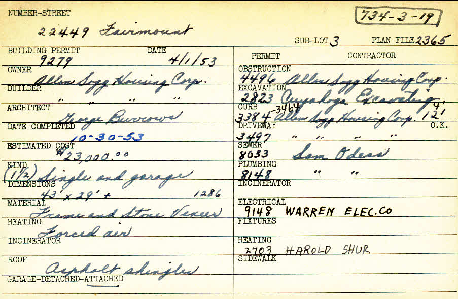 22449 Fairmount Boulevard Shaker Heights, OH 44122 PARCEL ID: 734-03-019 Building Permit Date: 04-01-1953 Plan File Number: 2365 Microfilm Roll: Roll#34 Neighborhood: Mercer Owner: Allen Sogg Housing Corporation Builder: Allen Sogg Housing Corporation Architect: Burrows, George Estimated Cost: 23000 Date Completed: 10-30-1953 Kind: Single Dwelling and Garage Material: Farme and Stone Veneer Heating: Forced Air Roof: Asphalt Shingles Garage: attached |