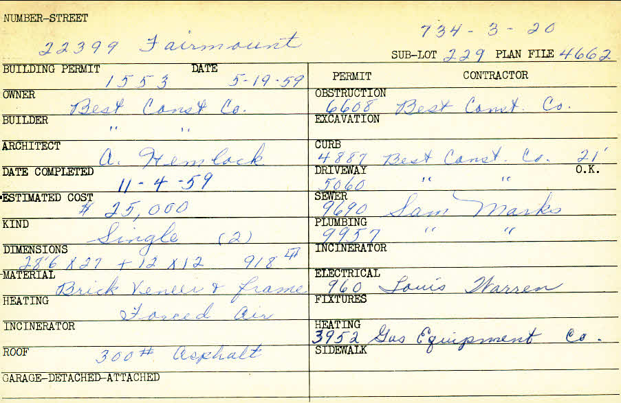 22399 Fairmount Boulevard Shaker Heights, OH 44122 PARCEL ID: 734-03-020 Building Permit Date: 05-19-1959 Plan File Number: 4662 Microfilm Roll: Roll#65 Neighborhood: Mercer Owner: Best Construction Company Builder: Best Construction Company Architect: Hemlock, A. Estimated Cost: 25000 Date Completed: 11-04-1959 Kind: Single, Single Residence or Dwelling (2) Material: Brick Veneer and Frame Heating: Forced Air Roof: Asphalt |
