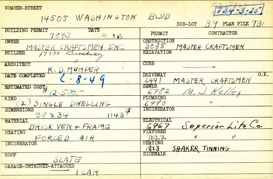 14505 Washington Boulevard Shaker Heights, OH 44118 PARCEL ID: 734-03-025 Building Permit Date: 07-03-1948 Plan File Number: 731 all scanned Microfilm Roll: Roll010 Neighborhood: Mercer Owner: Master Craftsmen, Inc. Builder: Master Craftsmen, Inc. Architect: Mumper, R. D. Estimated Cost: 12500 Date Completed: 02-08-1949 Kind: Single, Single Residence or Dwelling (2) Material: Brick Veneer and Frame Heating: Forced Air Roof: Slate Garage: attached |