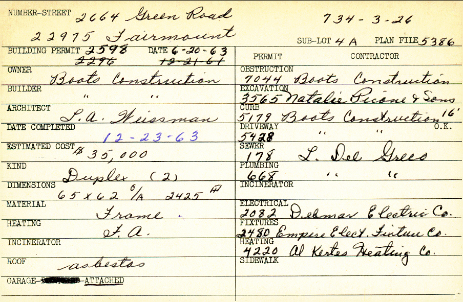 2664 Green Road Shaker Heights, OH 44122 PARCEL ID: 734-03-026 Building Permit Date: 06-20-1963 Plan File Number: 5386 Microfilm Roll: Roll#73 Neighborhood: Mercer Owner: Boots Construction Builder: Boots Construction Architect: Weissman, L. A. Estimated Cost: 35000 Date Completed: 12-23-1963 Kind: Duplex or Two-Family Material: Frame Heating: Forced Air Roof: Asbestos Garage: attached |