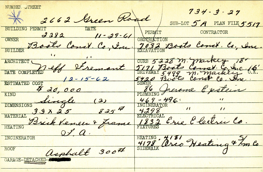 2662 Green Road Shaker Heights, OH 44122 PARCEL ID: 734-03-027 Building Permit Date: 11-29-1961 Plan File Number: 5517, 10569 Microfilm Roll: Roll#67, Roll#75, NewRoll#4 Neighborhood: Mercer Owner: Boots Construction Company, Inc. Builder: Boots Construction Company, Inc. Architect: Neff Fremont Estimated Cost: 20000 Date Completed: 12-15-1962 Kind: Single, Single Residence or Dwelling (2) Material: Brick Veneer and Frame Heating: Forced Air Roof: 300# Min Asphalt Garage: detached |