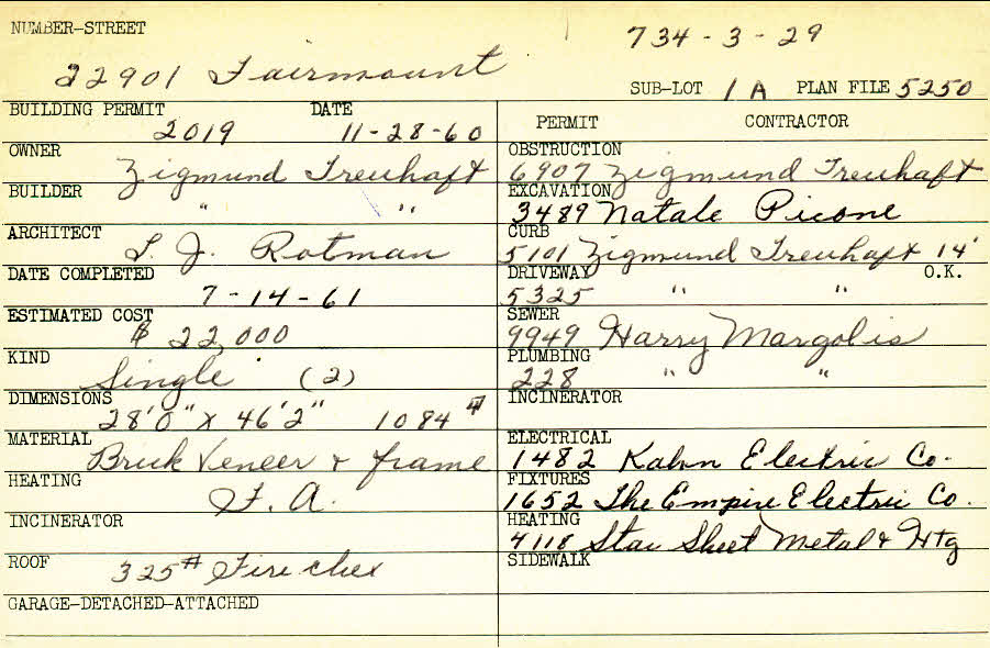 22901 Fairmount Boulevard Shaker Heights, OH 44122 PARCEL ID: 734-03-029 Building Permit Date: 11-28-1960 Plan File Number: 5250 Microfilm Roll: Roll#72 Neighborhood: Mercer Owner: Treuhaft, Zigmund Builder: Treuhaft, Zigmund Architect: Rotman, L. J. Estimated Cost: 22000 Date Completed: 07-14-1961 Kind: Single, Single Residence or Dwelling (2) Material: Brick Veneer and Frame Heating: Forced Air Roof: Asphalt |