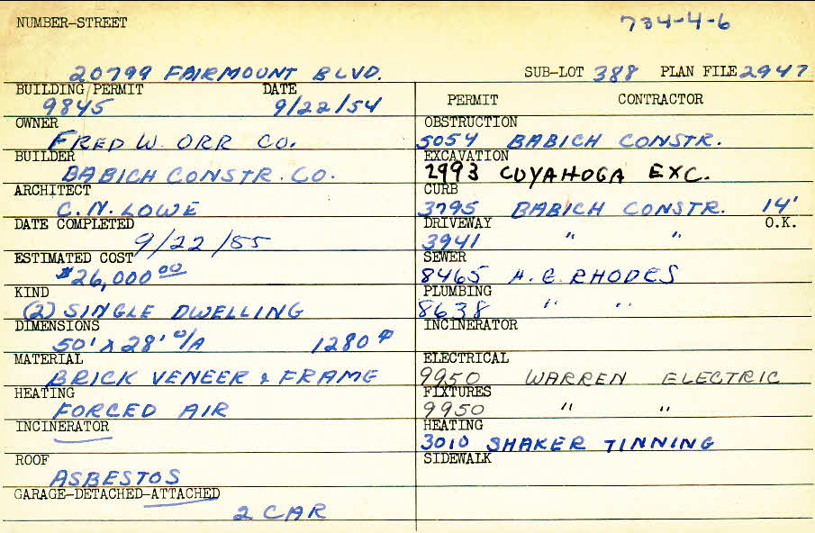 20799 Fairmount Boulevard Shaker Heights, OH 44120 PARCEL ID: 734-04-006 Building Permit Date: 09-22-1954 Plan File Number: 2947, 9237 Microfilm Roll: Roll#42, Roll#102 Neighborhood: Mercer Owner: Fred W. Orr Company Builder: Babich Construction Company Architect: Lowe, C. N. Estimated Cost: 26000 Date Completed: 09-22-1955 Kind: Single, Single Residence or Dwelling (2) Material: Brick Veneer and Frame Heating: Forced Air Roof: Asbestos Garage: attached 2 car |