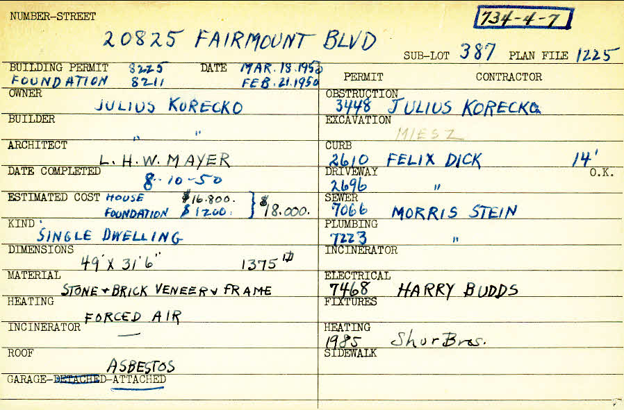 20825 Fairmount Boulevard Shaker Heights, OH 44120 PARCEL ID: 734-04-007 Building Permit Date: 03-18-1950 Plan File Number: 1225 scanned, 12219 Microfilm Roll: Roll014, NewRoll#11 Neighborhood: Mercer Owner: Korecko, Julius Builder: Korecko, Julius Architect: Mayer, L. H. W. Estimated Cost: 18000 Date Completed: 08-10-1950 Kind: Single, Single Residence or Dwelling Material: Stone and Brick Veneer and Frame Heating: Forced Air Roof: Asbestos Garage: attached |