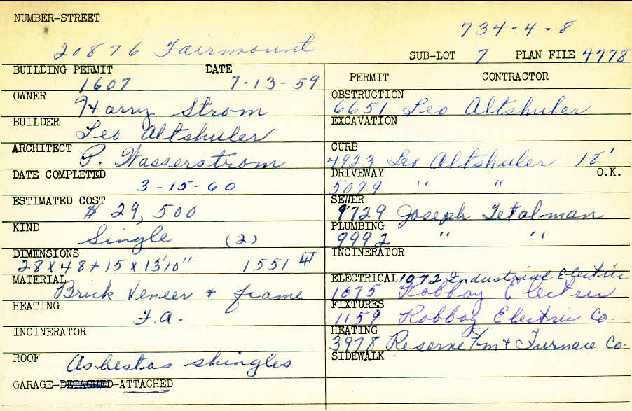 20876 Fairmount Boulevard Shaker Heights, OH 44122 PARCEL ID: 734-04-008 Building Permit Date: 07-13-1959 Plan File Number: 4778 Microfilm Roll: Roll#66 Neighborhood: Mercer Owner: Strom, Harry Builder: Altshuler, Leo Architect: Wasserstrom, P. Estimated Cost: 29500 Date Completed: 03-15-1960 Kind: Single, Single Residence or Dwelling (2) Material: Brick Veneer and Frame Heating: Forced Air Roof: Asbestos Shingles Garage: attached |