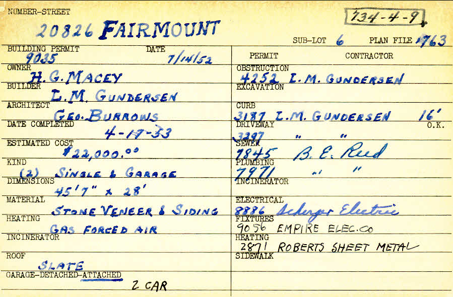 20826 Fairmount Boulevard Shaker Heights, OH 44122 PARCEL ID: 734-04-009 Building Permit Date: 07-14-1952 Plan File Number: 1763 scanned, 10136 Microfilm Roll: Roll26A, NewRoll#2 Neighborhood: Mercer Owner: Macey, H. G. Builder: Gundersen, L. M. Architect: Burrows, George Estimated Cost: 22000 Date Completed: 04-17-1953 Kind: Single Dwelling and Garage (2) Material: Stone Veneer and Siding Heating: Forced Air - Gas Roof: Slate Garage: attached 2 car |