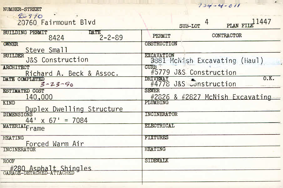 20760 Fairmount Boulevard Shaker Heights, OH 44120 PARCEL ID: 734-04-011 Building Permit Date: 02-02-1989 Plan File Number: 11447* Microfilm Roll: (see below) Neighborhood: Mercer Owner: Small, Steve Builder: J and S Construction Architect: Richard A. Beck and Associates Estimated Cost: 140000 Date Completed: 03-23-1990 Kind: Duplex or Two-Family Material: Frame Heating: Forced Air Roof: Asphalt Shingles |