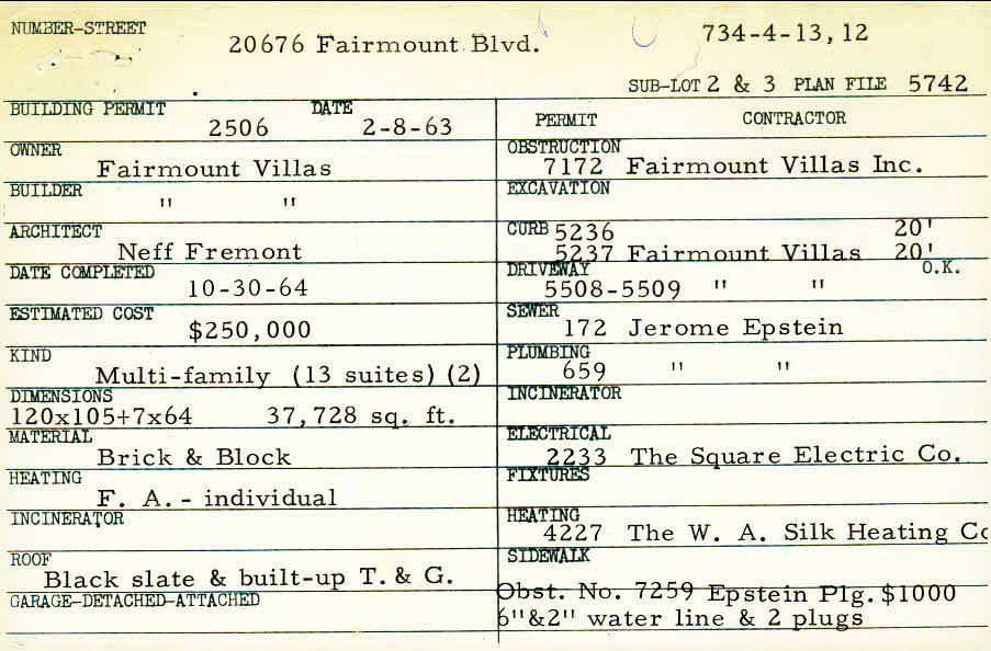 20676 Fairmount Boulevard Shaker Heights, OH 44120 PARCEL ID: 734-04-012 Building Permit Date: 02-08-1963 Plan File Number: 5742 Microfilm Roll: Roll#77 Neighborhood: Mercer Owner: Fairmount Villas Builder: Fairmount Villas Architect: Neff Fremont Estimated Cost: 250000 Date Completed: 10-30-1964 Kind: Apartment or Multi-family (3+) Material: Brick and Block Heating: Forced Air Roof: Slate |