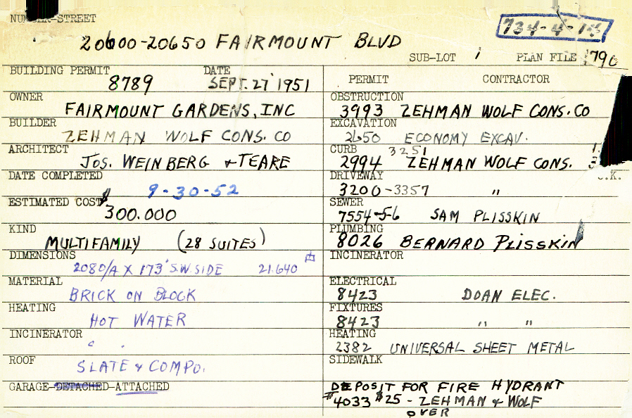 20600 Fairmount Boulevard Shaker Heights, OH 44120 PARCEL ID: 734-04-014 Building Permit Date: 09-27-1951 Plan File Number: 1790 all scanned Microfilm Roll: Roll027 Neighborhood: Mercer Owner: Fairmount Gardens, Inc. Builder: Zehman Wolf Construction Company Architect: Joseph Weinberg and Teare Estimated Cost: 300000 Date Completed: 09-30-1952 Kind: Apartment or Multi-family (3+) Material: Brick on Block Heating: Hot Water Roof: Slate Garage: attached |