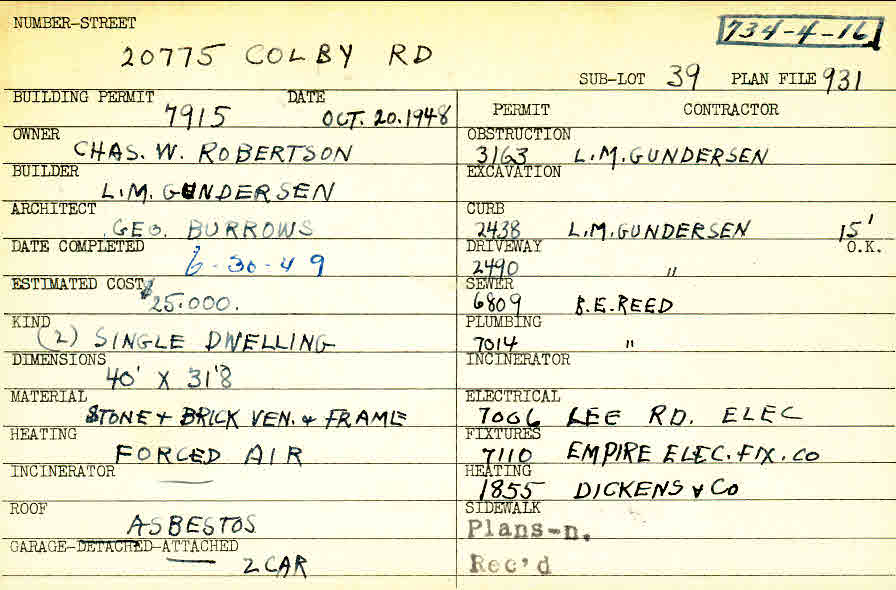 20775 Colby Road Shaker Heights, OH 44122 PARCEL ID: 734-04-016 Building Permit Date: 10-20-1948 Plan File Number: 931 scanned, 5777 Microfilm Roll: Roll012, Roll#78 Neighborhood: Mercer Owner: Robertson, Charles W. Builder: Gundersen, L. M. Architect: Burrows, George Estimated Cost: 25000 Date Completed: 06-30-1949 Kind: Single, Single Residence or Dwelling (2) Material: Stone and Brick Veneer and Frame Heating: Forced Air Roof: Asbestos Garage: attached 2 car |