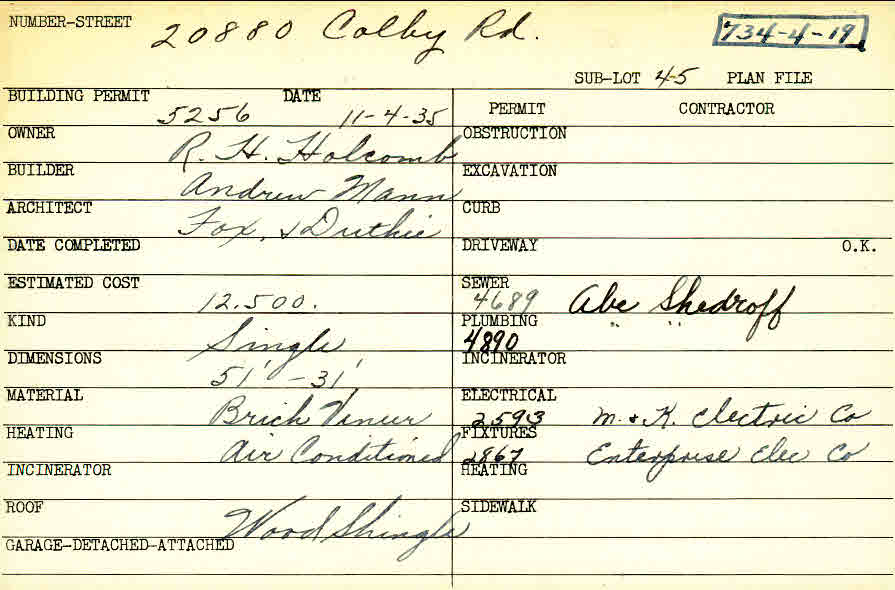 20880 Colby Road Shaker Heights, OH 44122 PARCEL ID: 734-04-019 Building Permit Date: 11-04-1935 Plan File Number: 0 Neighborhood: Mercer Owner: Holcomb, R. H. Builder: Mann, Andrew Architect: Fox and Duthie Estimated Cost: 12500 Kind: Single, Single Residence or Dwelling Material: Brick Veneer Heating: Air Conditioned Roof: Wood Shingle Card Available: yes |