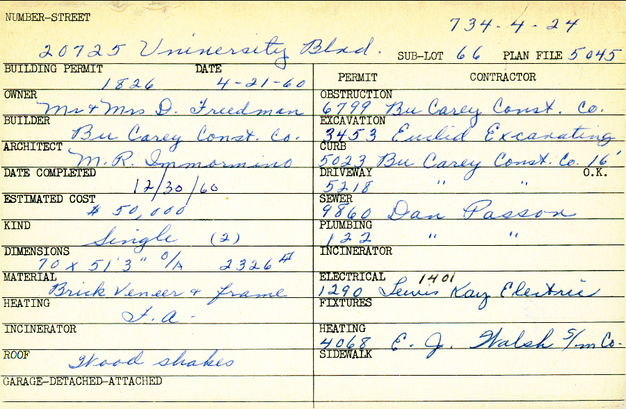 20725 University Boulevard Shaker Heights, OH 44122 PARCEL ID: 734-04-024 Building Permit Date: 04-21-1960 Plan File Number: 5045, 7399 Microfilm Roll: Roll#69, Roll#92 Neighborhood: Mercer Owner: Friedman, Mr and Mrs D. Builder: BuCarey Construction Company Architect: Immormino, M. R. Estimated Cost: 50000 Date Completed: 12-30-1960 Kind: Single, Single Residence or Dwelling (2) Material: Brick Veneer and Frame Heating: Forced Air Roof: Wood Shakes |