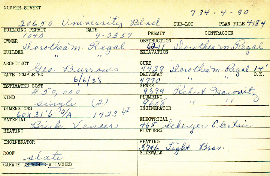 20650 University Boulevard Shaker Heights, OH 44122 PARCEL ID: 734-04-030 Building Permit Date: 09-23-1957 Plan File Number: 4184 Microfilm Roll: Roll#61 Neighborhood: Mercer Owner: Regal, Dorothea M. Builder: Regal, Dorothea M. Architect: Burrows, George Estimated Cost: 50000 Date Completed: 06-06-1958 Kind: Single, Single Residence or Dwelling (2) Material: Brick Veneer Roof: Slate Garage: attached |