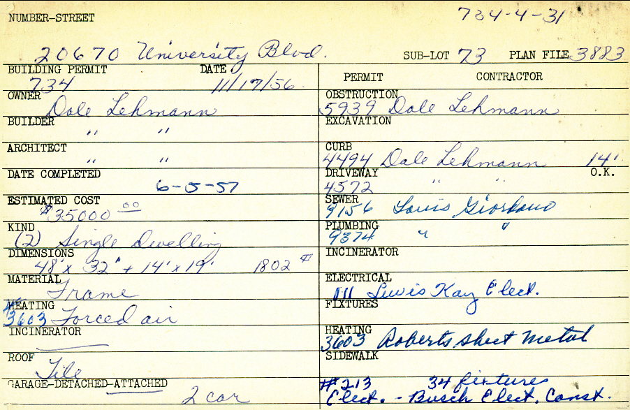 20670 University Boulevard Shaker Heights, OH 44122 PARCEL ID: 734-04-031 Building Permit Date: 11-17-1956 Plan File Number: 3883, 7590, 11043 Microfilm Roll: Roll#56, Roll#93, NewRoll#6 Neighborhood: Mercer Owner: Lehman, Dale Builder: Lehman, Dale Architect: Lehman, Dale Estimated Cost: 35000 Date Completed: 06-05-1957 Kind: Single, Single Residence or Dwelling (2) Material: Frame Heating: Forced Air Roof: Tile Garage: attached 2 car |