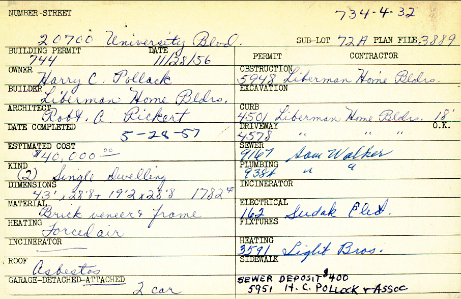 20700 University Boulevard Shaker Heights, OH 44122 PARCEL ID: 734-04-032 Building Permit Date: 11-28-1956 Plan File Number: 3889, 6356 all scanned Microfilm Roll: Roll#57, Roll#85 Neighborhood: Mercer Owner: Pollack, Harry C. Builder: Liberman Home Builders Architect: Rickert, Robert A. Estimated Cost: 40000 Date Completed: 05-28-1957 Kind: Single, Single Residence or Dwelling (2) Material: Brick Veneer and Frame Heating: Forced Air Roof: Asbestos Garage: attached 2 car |