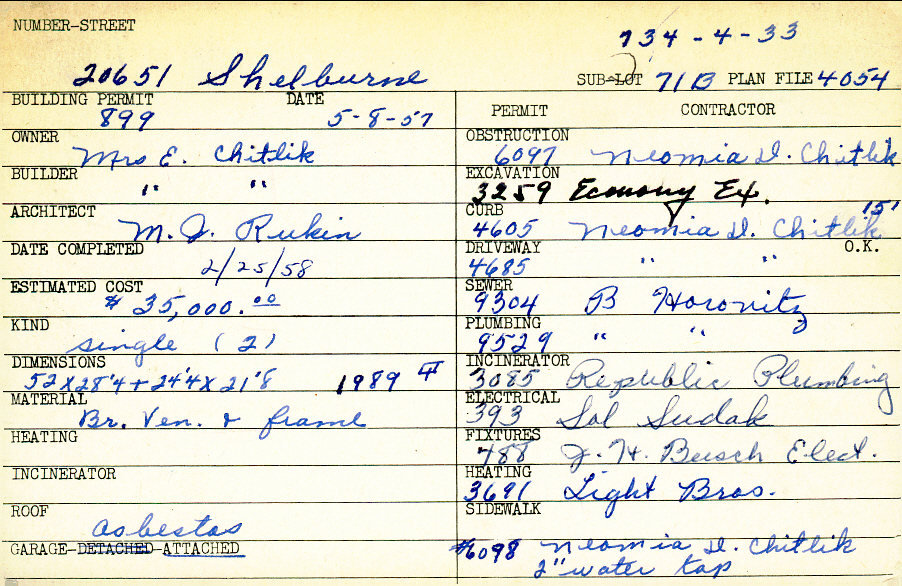 20651 Shelburne Road Shaker Heights, OH 44122 PARCEL ID: 734-04-033 Building Permit Date: 05-08-1957 Plan File Number: 4054, 3395 Microfilm Roll: Roll#49, Roll#59 Neighborhood: Mercer Owner: Chitlik, Mrs. E. Builder: Chitlik, Mrs. E. Architect: Rukin, M. J. Estimated Cost: 35000 Date Completed: 02-25-1958 Kind: Single, Single Residence or Dwelling (2) Material: Brick Veneer and Frame Roof: Asbestos Garage: attached |