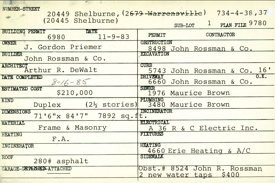 20449 Shelburne Road Shaker Heights, OH 44122 PARCEL ID: 734-04-037 Building Permit Date: 11-09-1983 Plan File Number: 9780* Microfilm Roll: Roll#104 Neighborhood: Malvern Owner: Priemer, J. Gordon Builder: John Rossman and Company Architect: DeWalt, Arthur R. Estimated Cost: 210000 Date Completed: 08-16-1985 Kind: Duplex or Two-Family Material: Frame and Masonry Heating: Forced Air Roof: Asphalt Garage: attached |