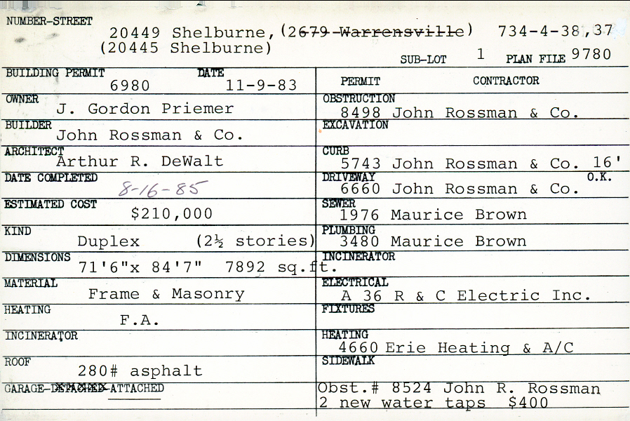 20449 Shelburne Road Shaker Heights, OH 44122 PARCEL ID: 734-04-038 Building Permit Date: 11-09-1983 Plan File Number: 7980, 9780 Microfilm Roll: Roll#104 Neighborhood: Malvern Owner: Priemer, J. Gordon Builder: John Rossman and Company Architect: DeWalt, Arthur R. Estimated Cost: 210000 Date Completed: 08-16-1985 Kind: Duplex or Two-Family Material: Frame and Masonry Heating: Forced Air Roof: Asphalt Garage: attached |