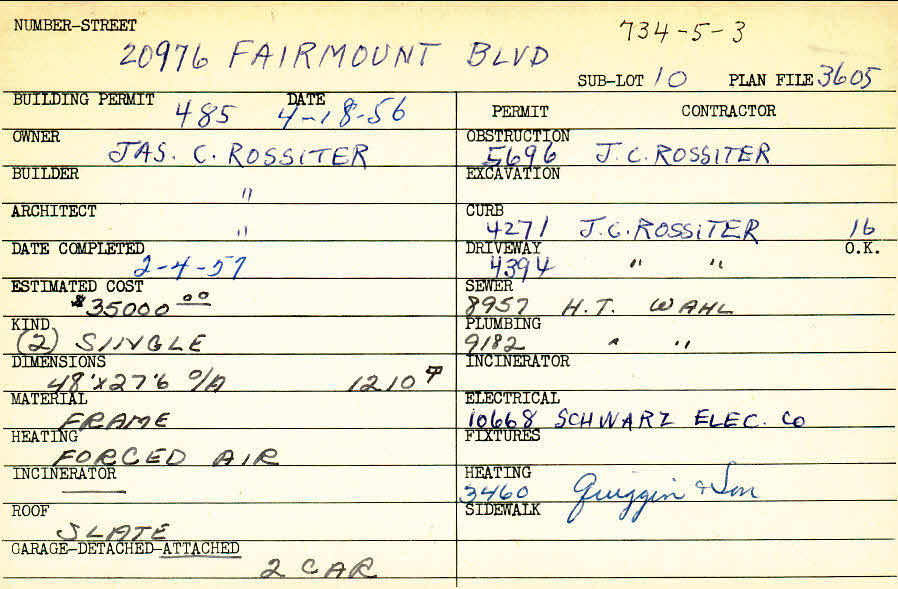 20976 Fairmount Boulevard Shaker Heights, OH 44122 PARCEL ID: 734-05-003 Building Permit Date: 04-18-1956 Plan File Number: 3605, 5365 Microfilm Roll: Roll#73 Neighborhood: Mercer Owner: Rossiter, James C. Builder: Rossiter, James C. Architect: Rossiter, James C. Estimated Cost: 35000 Date Completed: 02-04-1957 Kind: Single, Single Residence or Dwelling (2) Material: Frame Heating: Forced Air Roof: Slate Garage: attached 2 car |