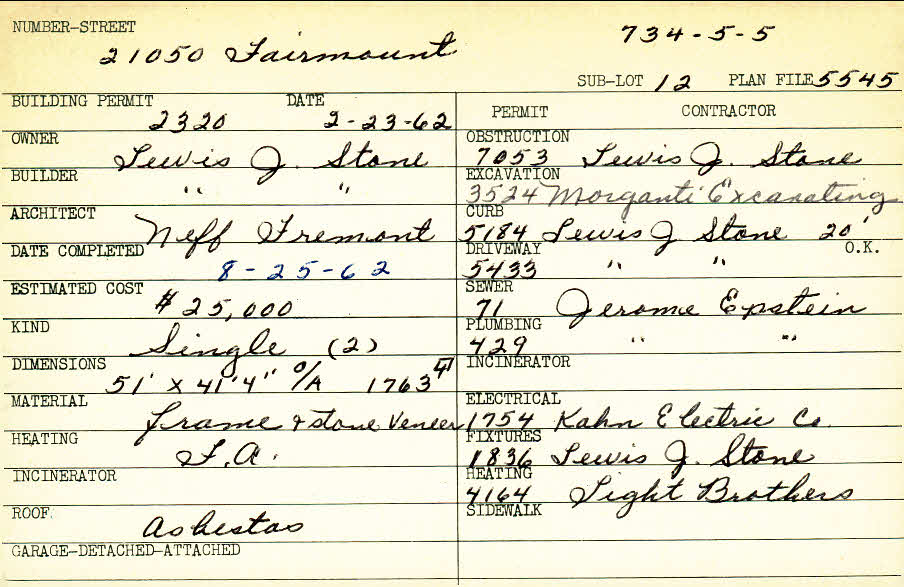 21050 Fairmount Boulevard Shaker Heights, OH 44122 PARCEL ID: 734-05-005 Building Permit Date: 02-23-1962 Plan File Number: 5545, 10329 Microfilm Roll: Roll#75, NewRoll#3 Neighborhood: Mercer Owner: Stone, Lweis J. Builder: Stone, Lewis J. Architect: Neff Fremont Estimated Cost: 25000 Date Completed: 08-25-1962 Kind: Single, Single Residence or Dwelling (2) Material: Frame and Stone Veneer Heating: Forced Air Roof: Asbestos |