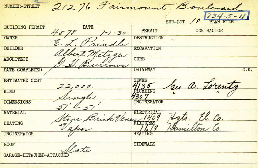 21276 Fairmount Boulevard Shaker Heights, OH 44122 PARCEL ID: 734-05-011 Building Permit Date: 07-01-1930 Plan File Number: 5947 Microfilm Roll: Roll#80 Neighborhood: Mercer Owner: Prindle, E. L. Builder: Metzger, Albert Architect: Burrows, G. H. Estimated Cost: 22000 Kind: Single, Single Residence or Dwelling Material: Stone and Brick Veneer Heating: Vapor Roof: Slate |