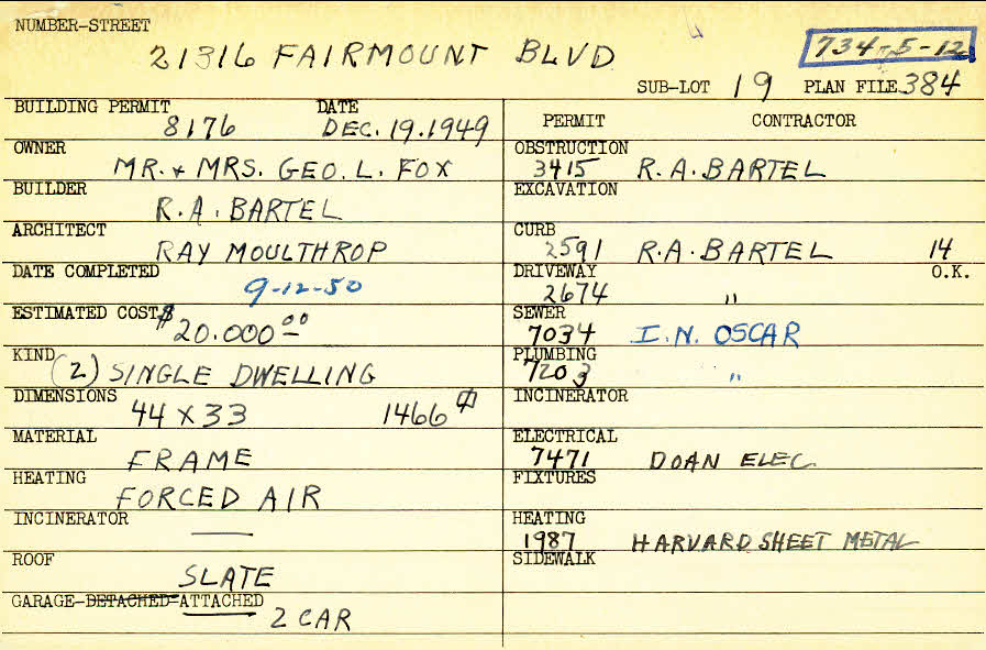 21316 Fairmount Boulevard Shaker Heights, OH 44122 PARCEL ID: 734-05-012 Building Permit Date: 12-19-1949 Plan File Number: 384 scanned, 4200 Microfilm Roll: Roll004, Roll#61 Neighborhood: Mercer Owner: Fox, Mr. and Mrs. George L. Builder: Bartel, R. A. Architect: Moulthrop, Ray Estimated Cost: 20000 Date Completed: 09-12-1950 Kind: Single, Single Residence or Dwelling (2) Material: Frame Heating: Forced Air Roof: Slate Garage: attached 2 car |