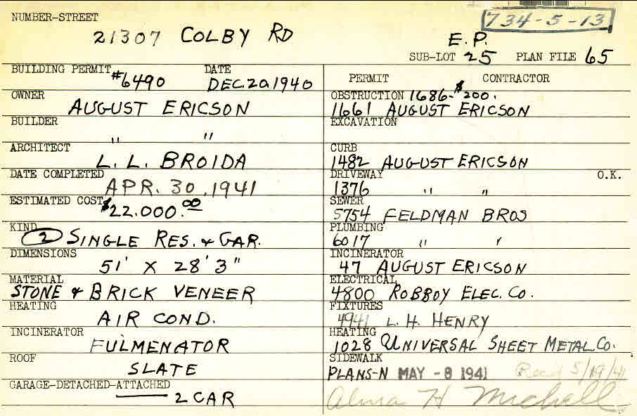 21307 Colby Road Shaker Heights, OH 44122 PARCEL ID: 734-05-013 Building Permit Date: 12-20-1940 Plan File Number: 65, 10523 Microfilm Roll: NewRoll#4 Neighborhood: Mercer Owner: Ericson, August Builder: Ericson, August Architect: Broida, L. L. Estimated Cost: 22000 Date Completed: 04-30-1941 Kind: Single Dwelling and Garage (2) Material: Stone and Brick Veneer Heating: Air Conditioned Roof: Slate Garage: attached 2 car |