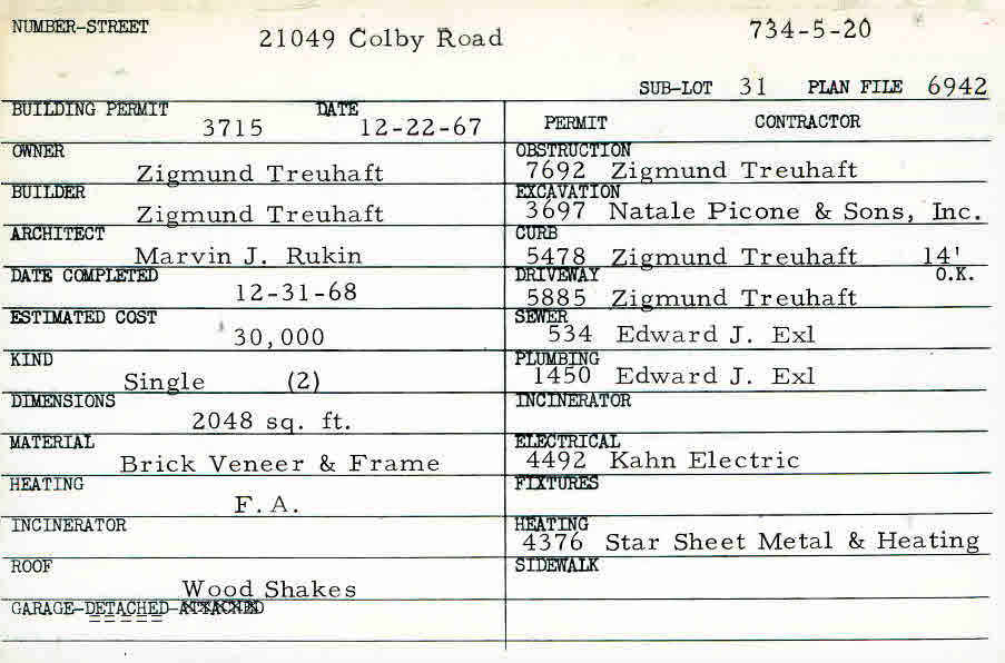 21049 Colby Road Shaker Heights, OH 44122 PARCEL ID: 734-05-020 Building Permit Date: 12-22-1967 Plan File Number: 6942 Microfilm Roll: Roll#90 Neighborhood: Mercer Owner: Treuhaft, Zigmund Builder: Treuhaft, Zigmund Architect: Rukin, Marvin J. Estimated Cost: 30000 Date Completed: 12-31-1968 Kind: Single, Single Residence or Dwelling (2) Material: Brick Veneer and Frame Heating: Forced Air Roof: Wood Shakes Garage: detached |