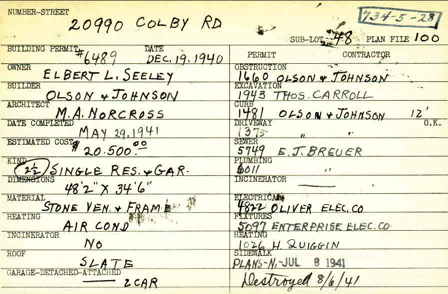 20990 Colby Road Shaker Heights, OH 44122 PARCEL ID: 734-05-028 Building Permit Date: 12-19-1940 Plan File Number: 100 Neighborhood: Mercer Owner: Seeley, Elbert L. Builder: Olson and Johnson Architect: Norcross, M. A. Estimated Cost: 20500 Date Completed: 05-29-1941 Kind: Single 2-1/2 Material: Stone Veneer and Frame Heating: Air Conditioned Roof: Slate Garage: attached 2 car |