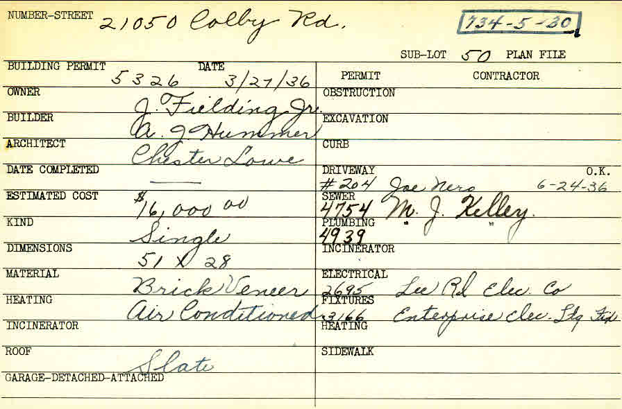 21050 Colby Road Shaker Heights, OH 44122 PARCEL ID: 734-05-030 Building Permit Date: 03-27-1936 Plan File Number: 0 Neighborhood: Mercer Owner: Fielding, J. Jr. Builder: Hummer, A. J. Architect: Lowe, Chester Estimated Cost: 16000 Kind: Single, Single Residence or Dwelling Material: Brick Veneer Heating: Air Conditioned Roof: Slate |