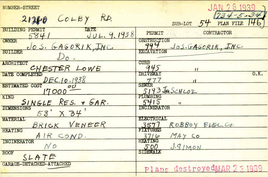 21210 Colby Road Shaker Heights, OH 44122 PARCEL ID: 734-05-034 Building Permit Date: 07-09-1938 Plan File Number: 146 Neighborhood: Mercer Owner: Joseph Gagorik, Inc. Builder: Joseph Gagorik, Inc. Architect: Lowe, Chester Estimated Cost: 17000 Date Completed: 12-10-1938 Kind: Single Dwelling and Garage Material: Brick Veneer Heating: Air Conditioned Roof: Slate Garage: attached |