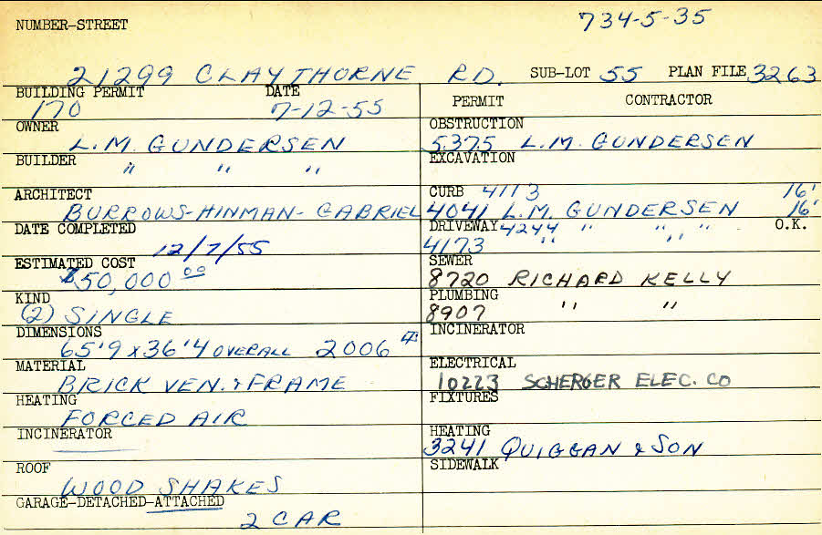 21299 Claythorne Road Shaker Heights, OH 44122 PARCEL ID: 734-05-035 Building Permit Date: 07-12-1955 Plan File Number: 3263, 5809 Microfilm Roll: Roll#47, Roll#78 Neighborhood: Mercer Owner: Gundersen, L. M. Builder: Gundersen, L. M. Architect: Burrows, Hinman, Gabriel Estimated Cost: 50000 Date Completed: 12-07-1955 Kind: Single, Single Residence or Dwelling (2) Material: Brick Veneer and Frame Heating: Forced Air Roof: Wood Shakes Garage: attached 2 car |