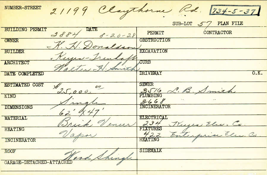 21199 Claythorne Road Shaker Heights, OH 44122 PARCEL ID: 734-05-037 Building Permit Date: 08-20-1928 Plan File Number: 7470 Microfilm Roll: Roll#93 Neighborhood: Mercer Owner: Donaldson, K. H. Builder: Keyes-Treuhaft Architect: Smith, Walter H. Estimated Cost: 25000 Kind: Single, Single Residence or Dwelling Material: Brick Veneer Heating: Vapor Roof: Wood Shingle Blueprints: Paper plans of this house are in the Walter H. Smith Collection in the Shaker Library Local History Room. Please contact the Local History Librarian for access. |