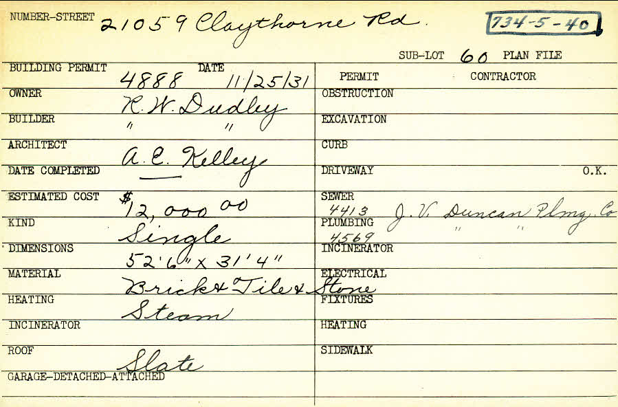 21059 Claythorne Road Shaker Heights, OH 44122 PARCEL ID: 734-05-040 Building Permit Date: 11-25-1931 Plan File Number: 0 Neighborhood: Mercer Owner: Dudley, R. W. Builder: Dudley, R. W. Architect: Kelley, A. E. Estimated Cost: 12000 Kind: Single, Single Residence or Dwelling Material: Brick, Tile and Stone Heating: Steam Roof: Slate Card Available: yes |