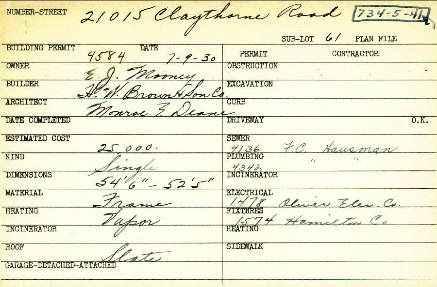 21015 Claythorne Road Shaker Heights, OH 44122 PARCEL ID: 734-05-041 Building Permit Date: 07-09-1930 Plan File Number: 5074, 6798 Microfilm Roll: Roll#69, Roll#88 Neighborhood: Mercer Owner: Mooney, E.J. Builder: H.W. Brown and Son Company Architect: Deane, Monroe Ensign Estimated Cost: 25000 Kind: Single, Single Residence or Dwelling Material: Frame Heating: Vapor Roof: Slate |