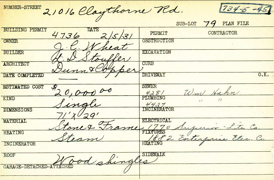 21016 Claythorne Road Shaker Heights, OH 44122 PARCEL ID: 734-05-045 Building Permit Date: 02-05-1931 Plan File Number: 0 Neighborhood: Mercer Owner: Wheat, J. C. Builder: Stouffer, L. D. Architect: Dunn and Copper Estimated Cost: 20000 Kind: Single, Single Residence or Dwelling Material: Stone and Frame Heating: Steam Roof: Wood Shingle Card Available: yes |
