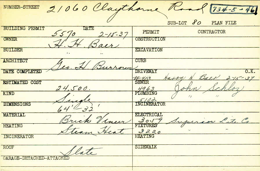 21060 Claythorne Road Shaker Heights, OH 44122 PARCEL ID: 734-05-046 Building Permit Date: 02-15-1937 Plan File Number: 7085 Microfilm Roll: Roll#91 Neighborhood: Mercer Owner: Baer, H. H. Builder: Baer, H. H. Architect: Burrows, George H. Estimated Cost: 24500 Kind: Single, Single Residence or Dwelling Material: Brick Veneer Heating: Steam Roof: Slate |