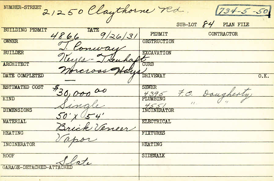 21250 Claythorne Road Shaker Heights, OH 44122 PARCEL ID: 734-05-050 Building Permit Date: 09-26-1931 Plan File Number: 0 Neighborhood: Mercer Owner: Conway, T. Builder: Keyes-Treuhaft Architect: Norcross and Hays Estimated Cost: 30000 Kind: Single, Single Residence or Dwelling Material: Brick Veneer Heating: Vapor Roof: Slate Card Available: yes |