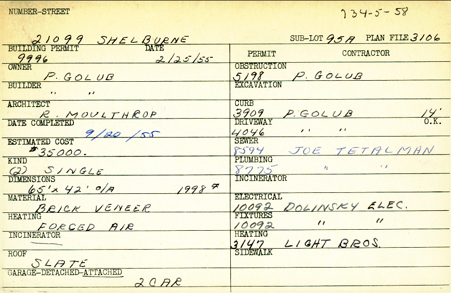21099 Shelburne Road Shaker Heights, OH 44122 PARCEL ID: 734-05-058 Building Permit Date: 02-25-1955 Plan File Number: 3106 Microfilm Roll: Roll#43 Neighborhood: Mercer Owner: Golub, P. Builder: Golub, P. Architect: Moulthrop, R. Estimated Cost: 35000 Date Completed: 09-20-1955 Kind: Single, Single Residence or Dwelling (2) Material: Brick Veneer Heating: Forced Air Roof: Slate Garage: attached 2 car |