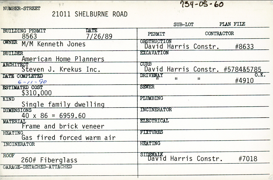 21011 Shelburne Road Shaker Heights, OH 44122 PARCEL ID: 734-05-060 Building Permit Date: 07-26-1989 Plan File Number: 3887, 11542* Microfilm Roll: Roll#56, Roll#57, NewRoll#8 Neighborhood: Mercer Owner: Jones, Mr. and Mrs. Kenneth Builder: American Home Planners Architect: Steven J. Krekus Inc. Estimated Cost: 310000 Date Completed: 06-11-1990 Kind: Single, Single Residence or Dwelling Material: Frame and Brick Veneer Heating: Forced Air - Gas Roof: Fiberglas |