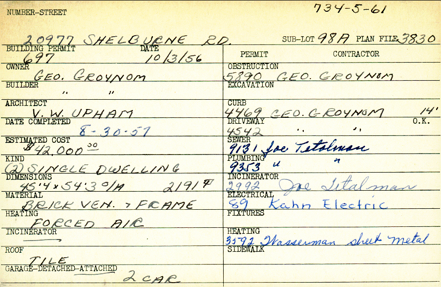 20977 Shelburne Road Shaker Heights, OH 44122 PARCEL ID: 734-05-061 Building Permit Date: 10-03-1956 Plan File Number: 3830 Microfilm Roll: Roll#56 Neighborhood: Mercer Owner: Groynom, George Builder: Groynom, George Architect: Upham, V. W. Estimated Cost: 42000 Date Completed: 08-30-1957 Kind: Single, Single Residence or Dwelling (2) Material: Brick Veneer and Frame Heating: Forced Air Roof: Tile Garage: attached 2 car |