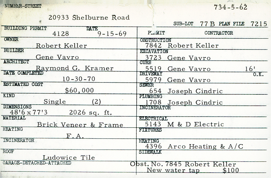 20933 Shelburne Road Shaker Heights, OH 44122 PARCEL ID: 734-05-062 Building Permit Date: 09-15-1969 Plan File Number: 7215 Microfilm Roll: Roll#92 Neighborhood: Mercer Owner: Keller, Robert Builder: Vavro, Gene Architect: Kramer, Raymond G. Estimated Cost: 60000 Date Completed: 10-30-1970 Kind: Single, Single Residence or Dwelling (2) Material: Brick Veneer and Frame Heating: Forced Air Roof: Tile |