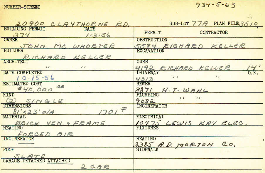 20900 Claythorne Road Shaker Heights, OH 44122 PARCEL ID: 734-05-063 Building Permit Date: 01-03-1956 Plan File Number: 3510 Microfilm Roll: Roll#51 Neighborhood: Mercer Owner: McWhorter, John Builder: Keller, Richard A. Architect: Keller, Richard A. Estimated Cost: 40000 Date Completed: 10-15-1956 Kind: Single, Single Residence or Dwelling (2) Material: Brick Veneer and Frame Heating: Forced Air Roof: Slate Garage: attached 2 car |
