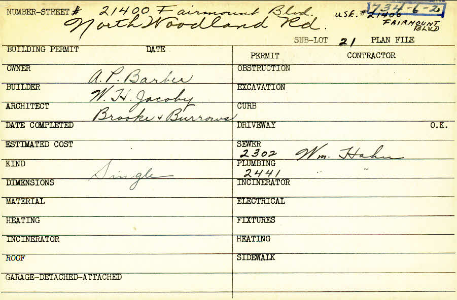 21400 Fairmount Boulevard Shaker Heights, OH 44122 PARCEL ID: 734-06-002 Plan File Number: 0 Neighborhood: Mercer Owner: Barber, A. P. Builder: Jacoby, W. H. Architect: Brooke and Burrows Kind: Single, Single Residence or Dwelling Card Available: yes |
