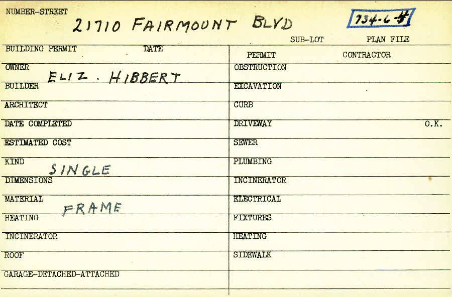 21710 Fairmount Boulevard Shaker Heights, OH 44122 PARCEL ID: 734-06-004 Plan File Number: 2775, 4655, 5728 all scanned Microfilm Roll: Roll038, Roll065, Roll077 Neighborhood: Mercer Owner: Hibbert, Elizabeth Kind: Single, Single Residence or Dwelling Material: Frame Blueprints: online, see link above |