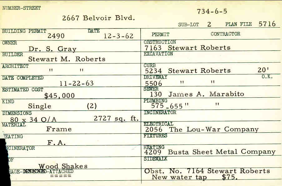 2667 Belvoir Boulevard Shaker Heights, OH 44122 PARCEL ID: 734-06-005 Building Permit Date: 12-03-1962 Plan File Number: 4636, 5716, 9980 all scanned Microfilm Roll: Roll065, Roll077, Roll105 Neighborhood: Mercer Owner: Gray, Dr. S. Builder: Roberts, Stewart M. Architect: Roberts, Stewart M. Estimated Cost: 45000 Date Completed: 11-22-1963 Kind: Single, Single Residence or Dwelling (2) Material: Frame Heating: Forced Air Roof: Wood Shakes Garage: attached |