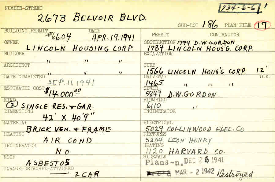 2673 Belvoir Boulevard Shaker Heights, OH 44122 PARCEL ID: 734-06-006 Building Permit Date: 04-19-1941 Plan File Number: 2818 scanned, 3301, 5084, 5353 Microfilm Roll: Roll041, Roll#48, Roll#69, Roll#73 Neighborhood: Mercer Owner: Lincoln Housing Corporation Builder: Lincoln Housing Corporation Architect: Lincoln Housing Corporation Estimated Cost: 14000 Date Completed: 09-11-1941 Kind: Single Dwelling and Garage (2) Material: Brick Veneer and Frame Heating: Air Conditioned Roof: Asbestos Garage: attached 2 car |