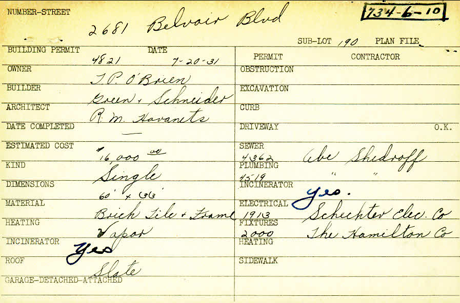 2681 Belvoir Boulevard Shaker Heights, OH 44122 PARCEL ID: 734-06-010 Building Permit Date: 07-20-1931 Plan File Number: 886 all scanned Microfilm Roll: Roll011 Neighborhood: Mercer Owner: O'Brien, T. P. Builder: Green and Schneider Architect: Hovanets, R. M. Estimated Cost: 16000 Kind: Single, Single Residence or Dwelling Material: Brick Tile and Frame Heating: Vapor Roof: Slate |